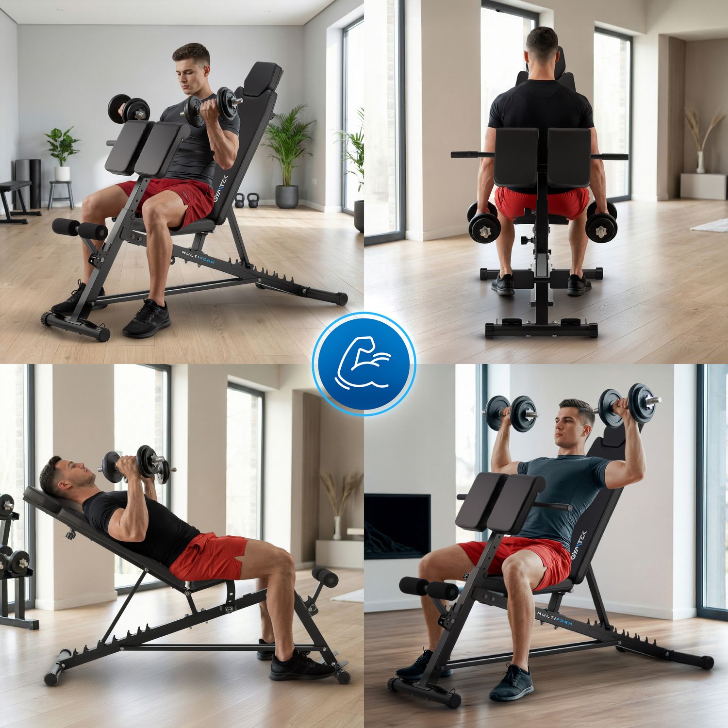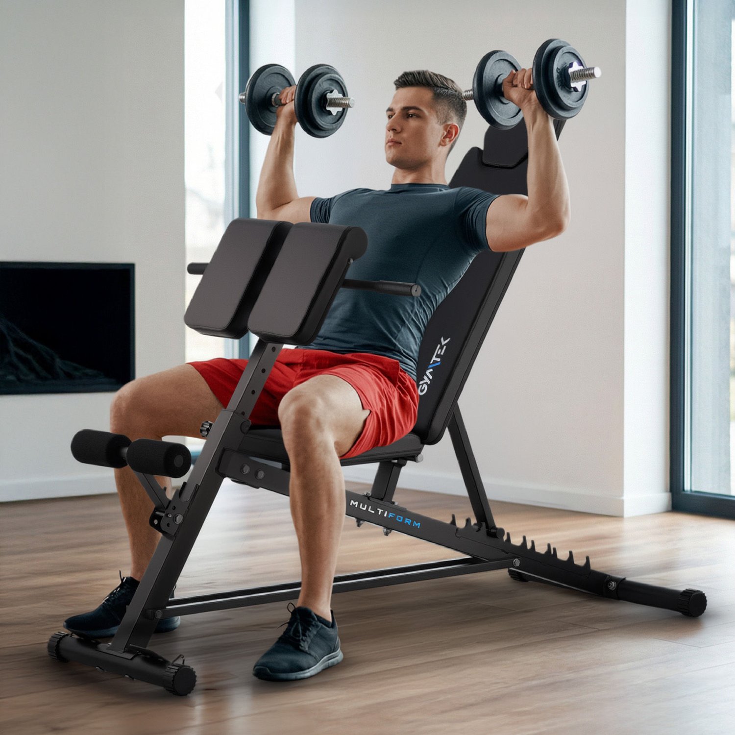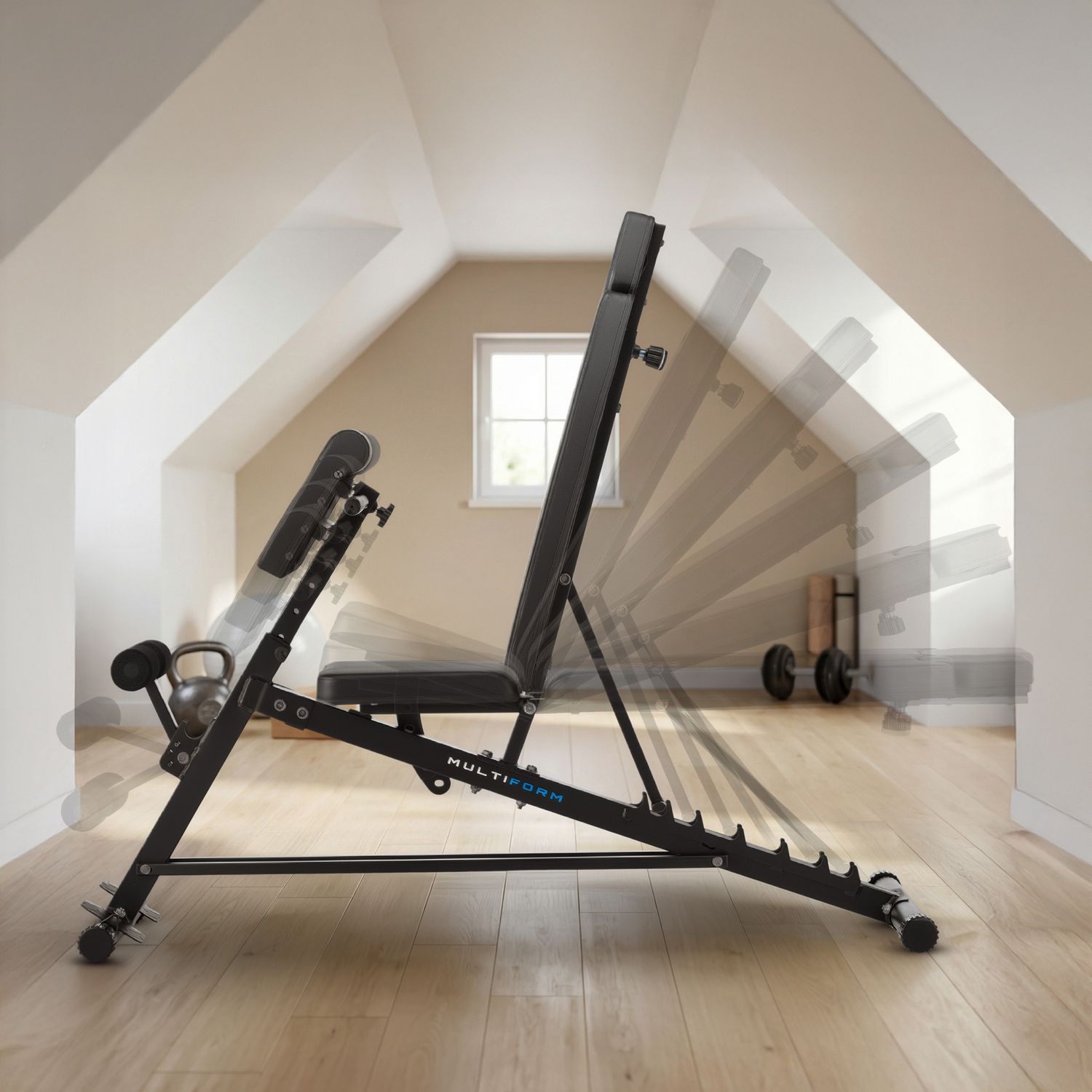 - Technologia MultiForm – stabilność i wszechstronność w jednym: Rozbudowana, solidna konstrukcja MultiForm z możliwością regulacji gwarantuje pełne bezpieczeństwo i komfort podczas treningu, umożliwiając wykonywanie wielu różnych ćwiczeń na jednej ławce.