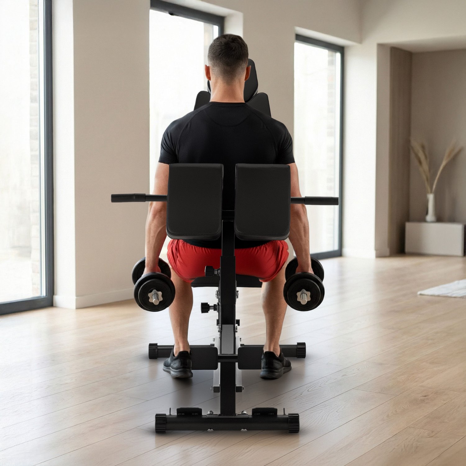 - Zintegrowany modlitewnik i ekspandery oporowe: Modlitewnik wspiera izolację pracy bicepsów, natomiast ekspandery z uchwytami zwiększają zakres ćwiczeń bez konieczności użycia ciężarów. Idealne rozwiązanie dla osób trenujących w domu z ograniczonym dostępem do obciążeń.