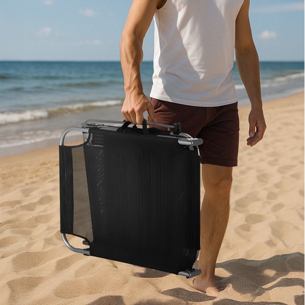- Łatwy transport: Dzięki poręcznym uchwytom i kompaktowym wymiarom po złożeniu, leżak bez problemu zmieści się w bagażniku auta, co ułatwia jego przewożenie na wakacje, biwak czy plażę.