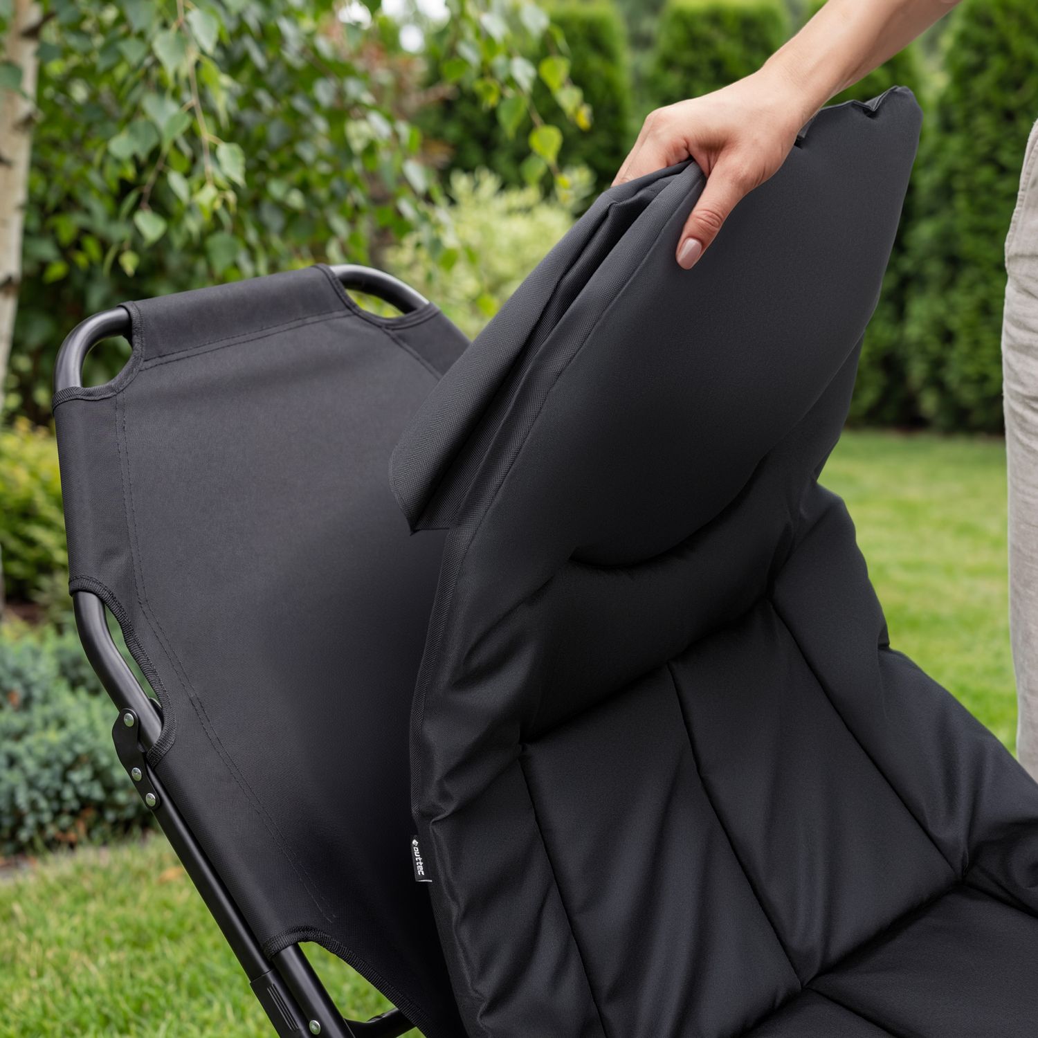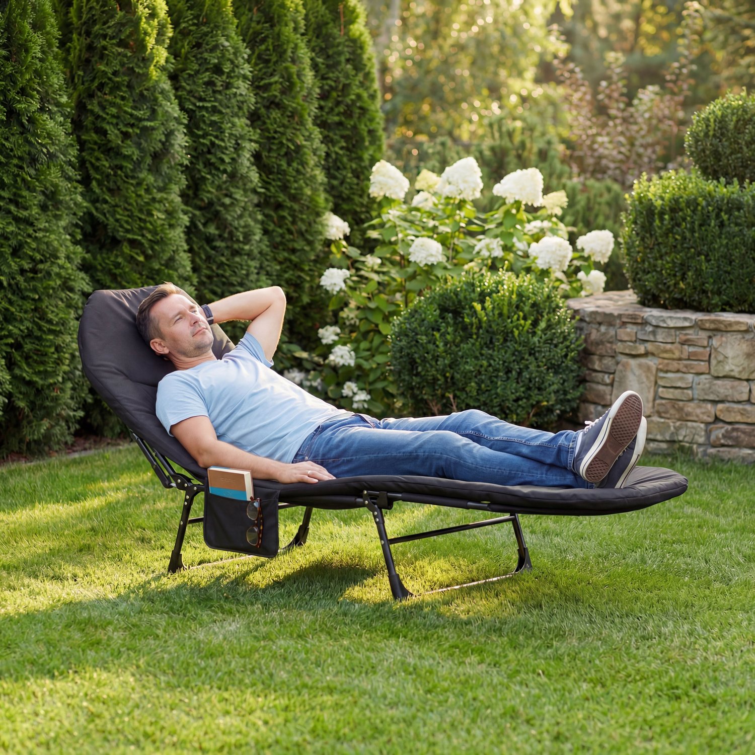 - Komfortowa regulacja pozycji: Siedzisko z piankowym wypełnieniem oraz 6-stopniowa regulacja oparcia pozwalają na dopasowanie pozycji do różnych potrzeb – od opalania po relaks w cieniu.