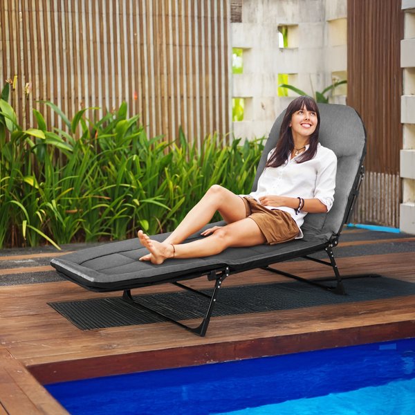 - Komfortowa regulacja pozycji: Siedzisko z piankowym wypełnieniem oraz 6-stopniowa regulacja oparcia pozwalają na dopasowanie pozycji do różnych potrzeb – od opalania po relaks w cieniu.