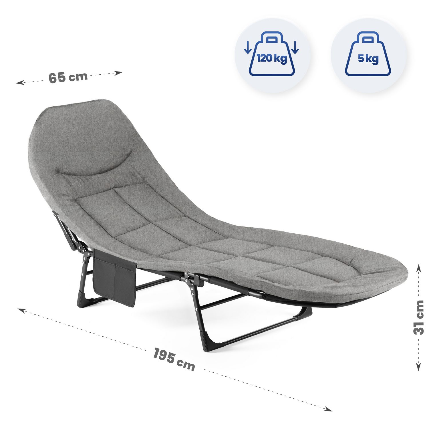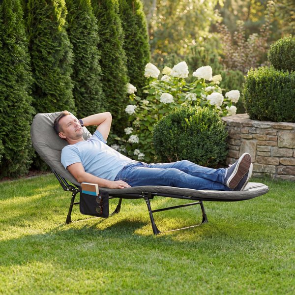 Leżak Outtec oferuje komfortowy wypoczynek dzięki miękkiemu siedzisku i 6-stopniowemu oparciu, które umożliwiają idealne dopasowanie pozycji do opalania lub relaksu w cieniu. Solidny stelaż ze stali malowanej proszkowo oraz wytrzymały materiał gwarantują stabilność użytkowania i udźwig do 120 kg w różnych warunkach plenerowych. Składana, lekka konstrukcja ułatwia przenoszenie i przechowywanie, a praktyczna boczna kieszeń pozwala mieć najpotrzebniejsze rzeczy zawsze pod ręką.