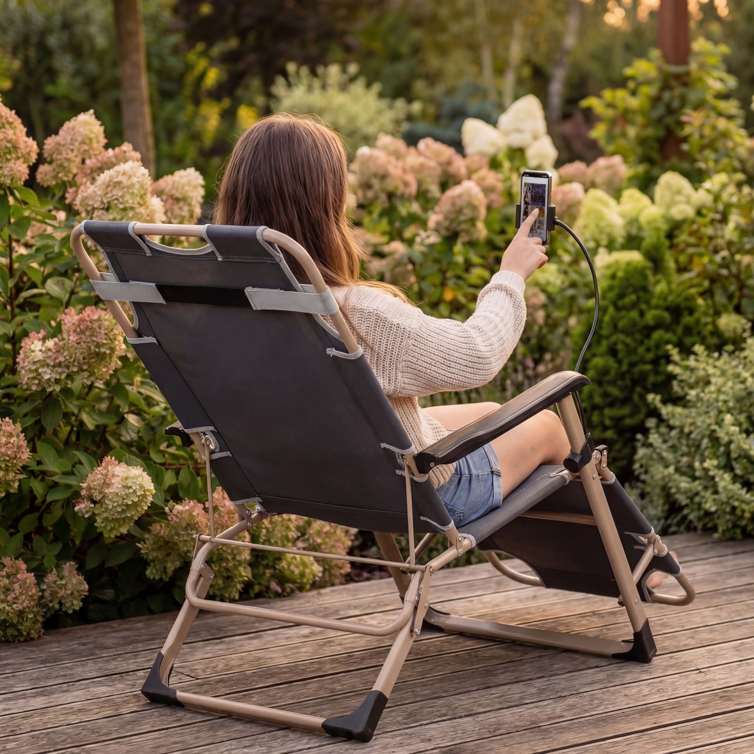 - Uchwyt na telefon w zasięgu ręki: Uchwyt na telefon umożliwia wygodne korzystanie ze smartfona podczas relaksu – bez konieczności odkładania go na ziemię czy szukania dodatkowego miejsca.