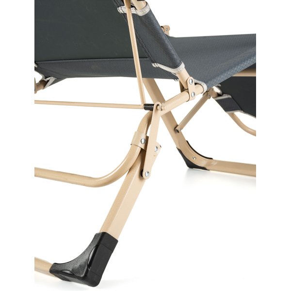 - Antypoślizgowe nakładki na nóżki wzmacniają pozycje leżaka, pozostawiając go zawsze w tym samym miejscu.