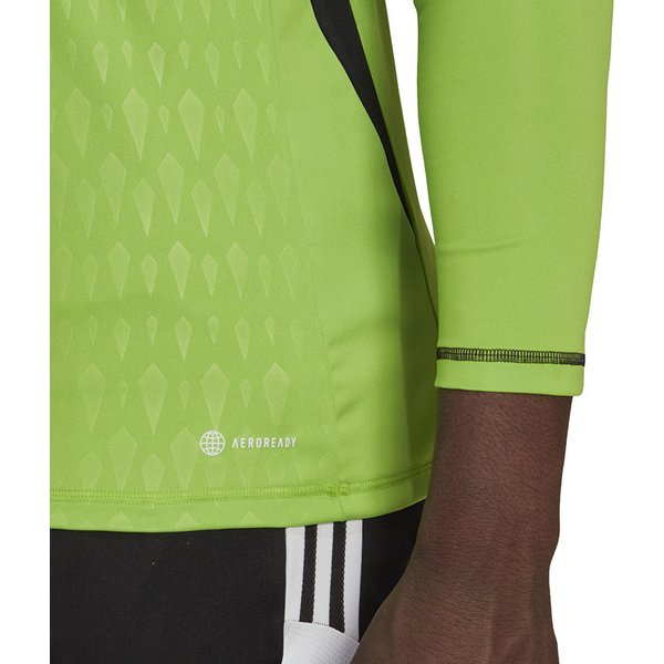 Bluza wykonana została z wytrzymałego poliestru z recyklingu. Regularny krój oraz elastyczność sprawiają, że Twoje ruchy są w pełni swobodne, co pozwala na skuteczniejszą obronę strzałów. Model ten posiada obniżoną linię ramion, trójkątny dekolt, a także lekko skrócone rękawy, aby zakładanie rękawic było łatwiejsze. Zastosowana technologia Aeroready skutecznie odprowadza wilgoć na zewnątrz, a także zapewnia suchość skóry, co przekłada się na większy komfort. Skup się w pełni na obronie strzałów i czuj się komfortowo w bramkarskiej bluzie Tiro 23 od Adidas.