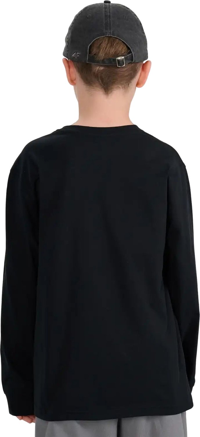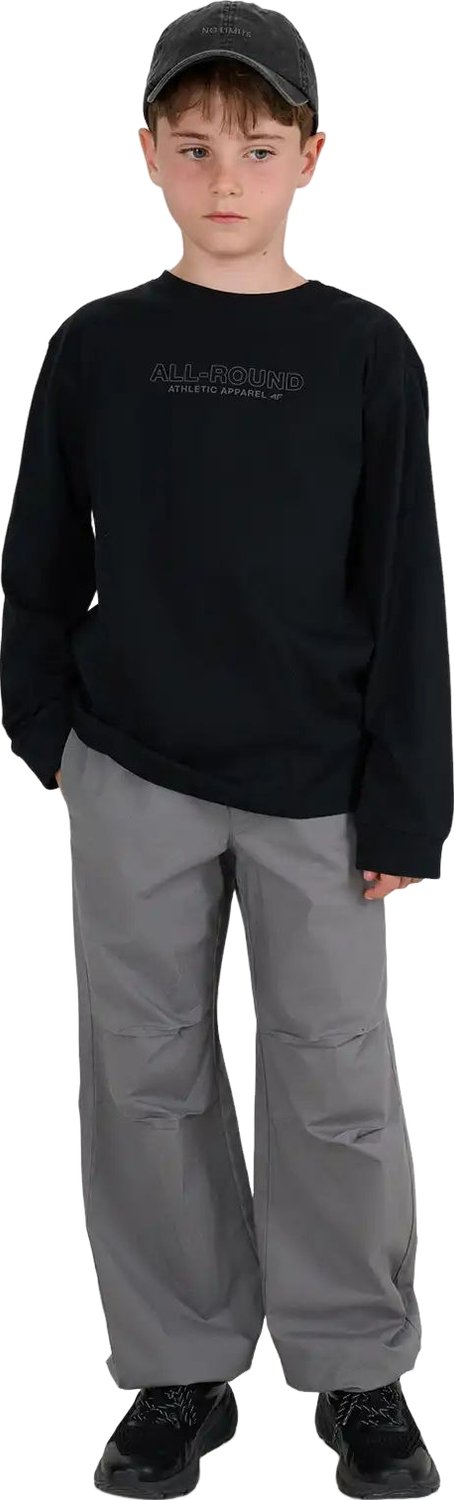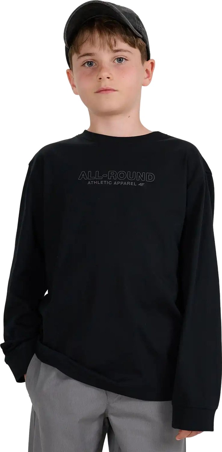 Longsleeve chłopięcy od marki 4F to doskonały wybór dla dzieci i młodzieży, łączący w sobie komfort noszenia z trwałością. Wykonany w 100% z miękkiej bawełny, zapewnia przyjemne uczucie na skórze, a dzięki gramaturze 200 gsm gwarantuje, że materiał nie prześwituje i zachowuje formę przez długi czas. Krój regular i elastyczny splot single jersey umożliwiają swobodne ruchy, co czyni go idealnym do różnych aktywności. Jednolita kolorystyka sprawia, że łatwo go zestawić z innymi elementami garderoby. Okrągły dekolt z lekkim ribowaniem oraz napis na przodzie dodają stylowego charakteru.