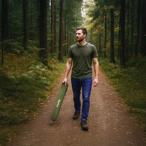 - Oszczędność miejsca: Po złożeniu łóżko ma kompaktowe wymiary, dzięki czemu zmieści się w ograniczonej przestrzeni, np. w bagażniku samochodu, schowku czy w plecaku trekkingowym.