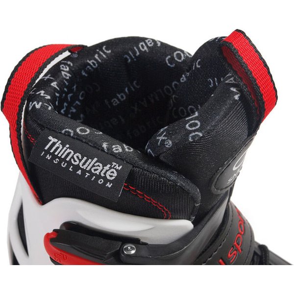 Prezentowany model dzięki regulowanej skorupie jest idealny do dzieci, bowiem pozwala na korzystanie z łyżew przez kilka sezonów. Wodoodporna, plastikowa budowa buta jest odporna na temperatury do -20°C, zapewnia więc bezpieczeństwo, odpowiednie dopasowanie i komfort jazdy. Miękka wewnętrzna skarpeta ogrzewa, przy jednoczesnym zapewnieniu dopływu powietrza. Regulacja rozmiarów jest prosta w obsłudze, a zarazem bezpieczna, nie ma możliwości samoczynnego przestawienia się rozmiaru.