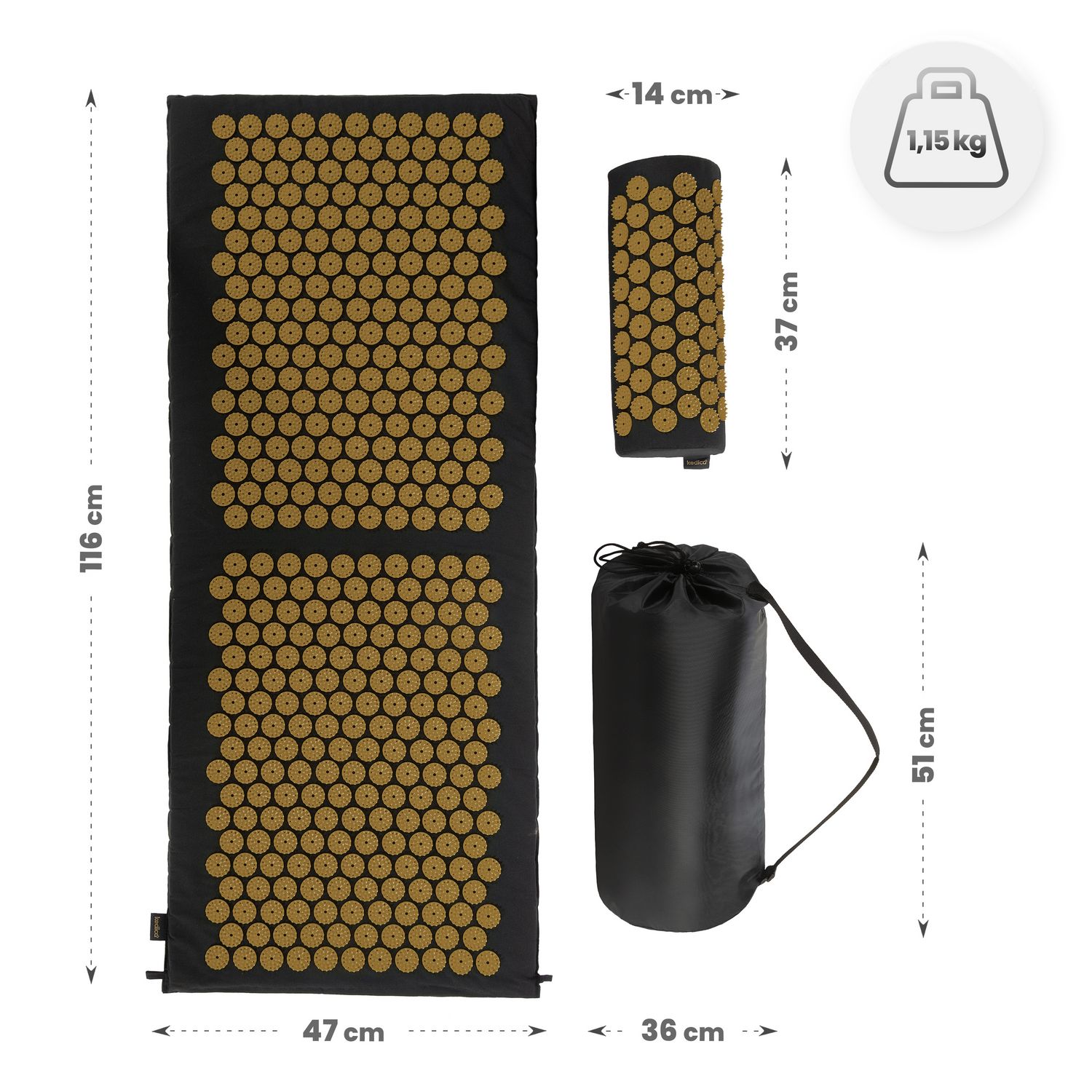 - Naturalna aktywacja układu nerwowego: 378 rozet na macie i 54 na poduszce – każda wyposażona w 33 kolce – zapewnia równomierną stymulację szerokiej powierzchni ciała. Impulsy odbierane przez receptory skórne pobudzają układ nerwowy, wspierając naturalny wzrost poziomu energii.