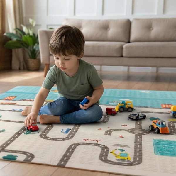- Dwustronny design dla różnorodnej zabawy: Dwie różne grafiki pozwalają szybko zmienić wygląd przestrzeni, wspierając naukę, zabawę i rozwój sensoryczny dziecka.