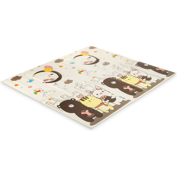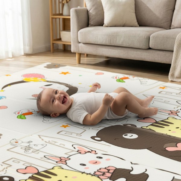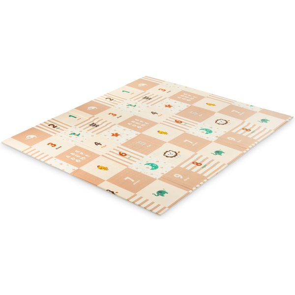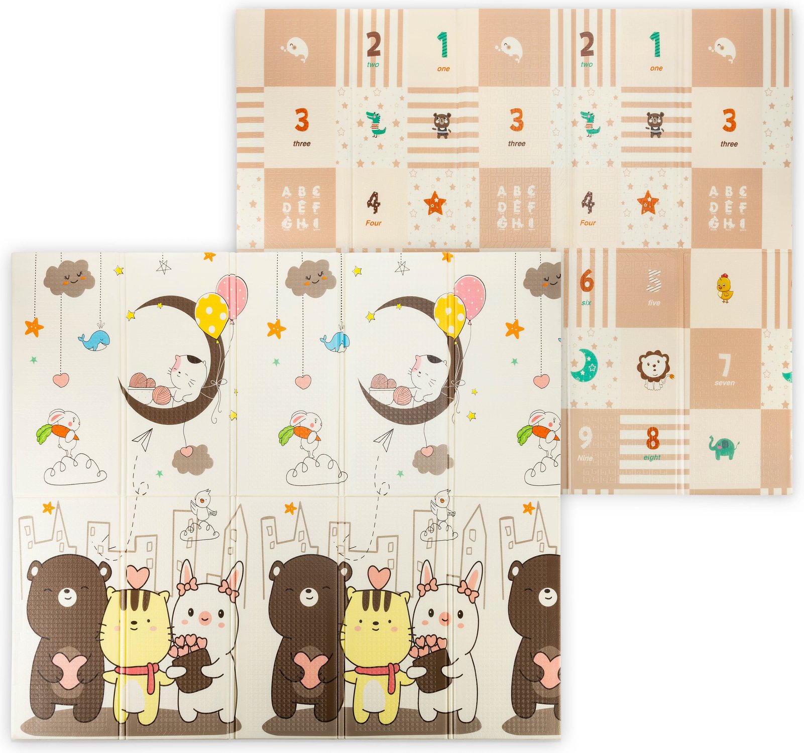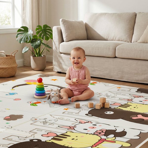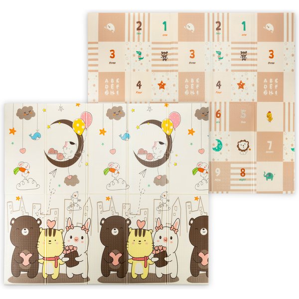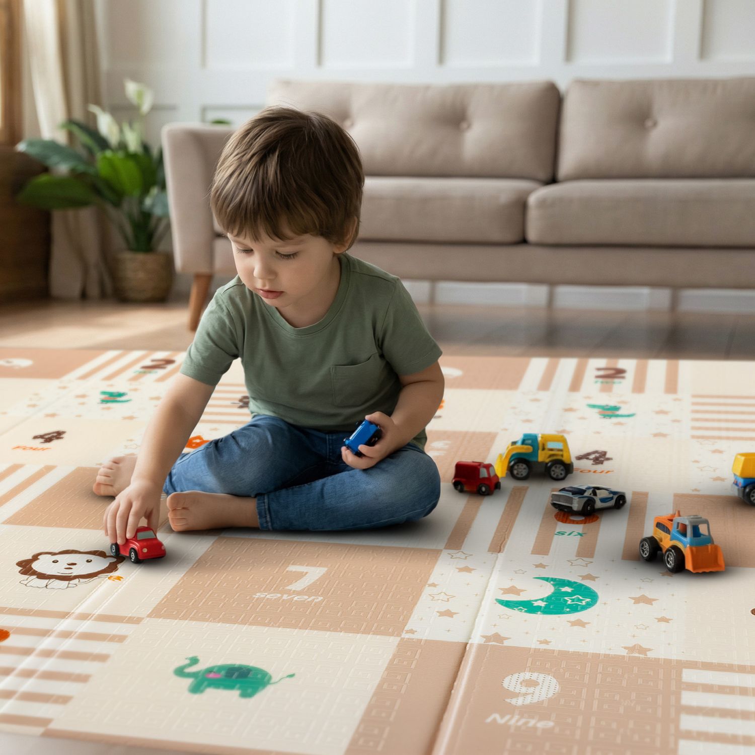 - Dwustronny design dla różnorodnej zabawy: Dwa różne wzory pozwalają szybko zmienić charakter przestrzeni – mata bawi, uczy i stymuluje rozwój sensoryczny dziecka.