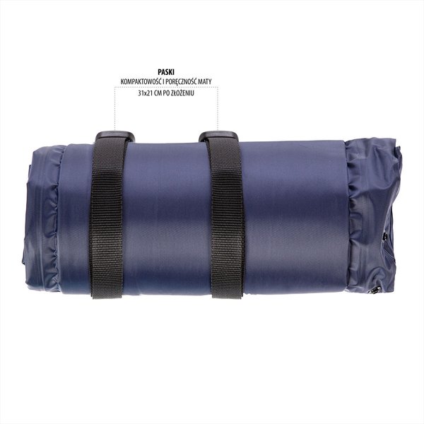 Składanie, podobnie jak rozkładanie, jest banalne i jest kwestią chwili. Po prostu odkręć korek i zacznij rolować matę od góry. Teraz zostało jedynie spiąć matę za pomocą dwóch pasków i już można ruszać w dalszą drogę! Praktyczny pokrowiec ułatwi Ci przenoszenie maty. W przypadku nieprzewidzianych awarii sytuację uratuje dołączony zestaw naprawczy.