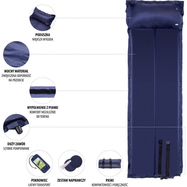 - materiał: 190T poliester, PVC, pianka PU o dużej gęstości, plastikowy zawór