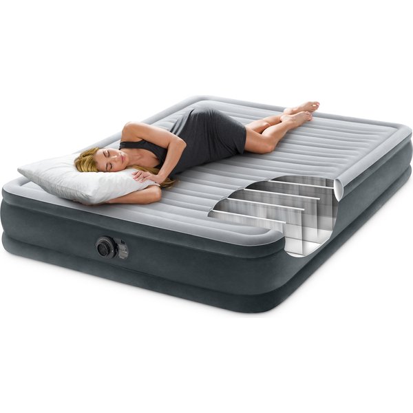 Materac 2-osobowy Comfort Plush Queen 152x203x33 cm z wbudowaną pompką elektryczną Intex to doskonały wybór dla osób poszukujących komfortu snu i wypoczynku.