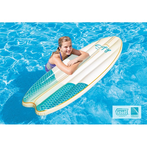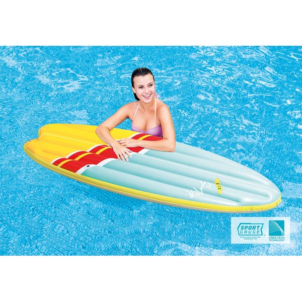 Solidna konstrukcja z polepszającą bezpieczeństwo podwójną komorą powietrzną jest wykonana z wysokojakościowego winylu. Materac o wymiarach 178 x 69 cm wyglądem imituje deskę surfingową przez co ciekawie się prezentuje.