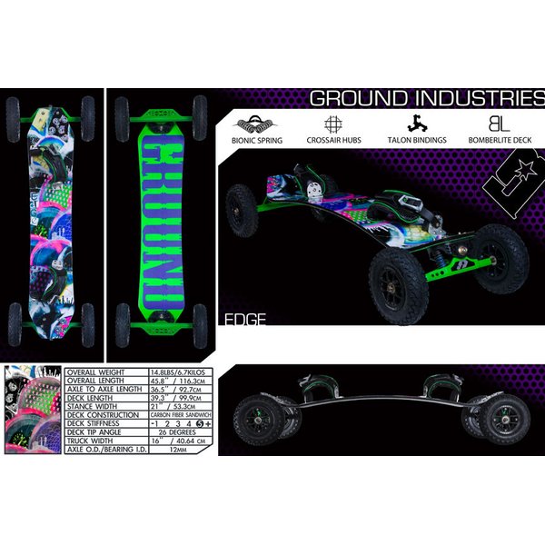 Edge jest wysokiej klasy mountainboardem amerykańskiej firmy Ground Industries. Ten model ma bardzo uniwersalny charakter. Choć sprawdzi się też podczas jazdy w terenie, to najbardziej go docenią amatorzy skoków i szybkiej jazdy po torze. Da również wiele frajdy przy jeździe za latawcem.