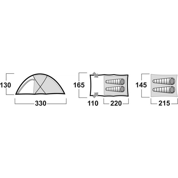 - wymiary namiotu: 165 × 330 × 130 cm (szer. x dł. x wys.)