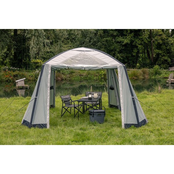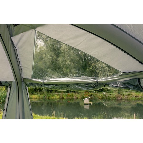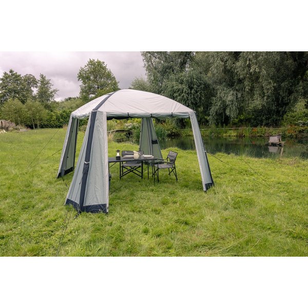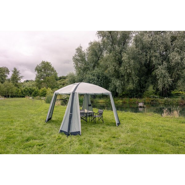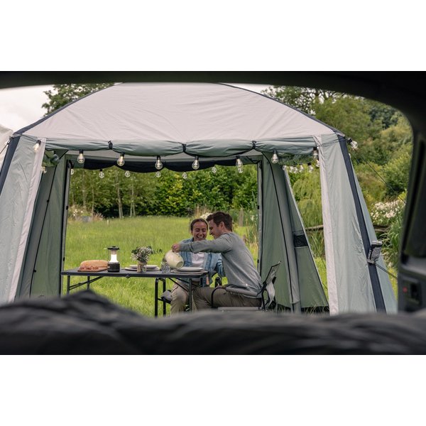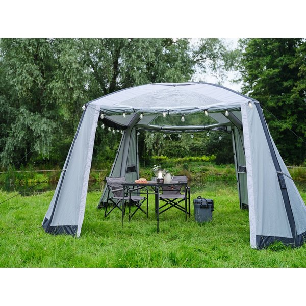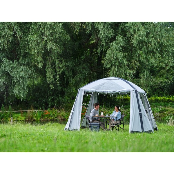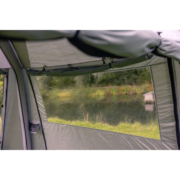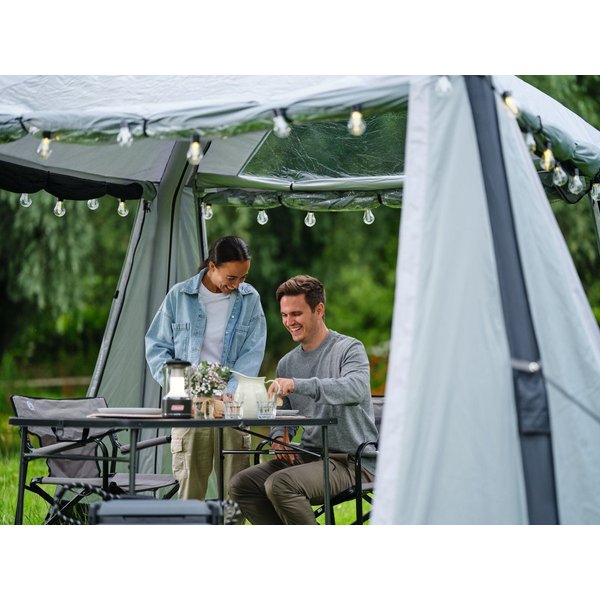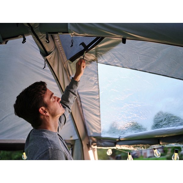 Przedsionek ten oferuje również skuteczną ochronę przed promieniowaniem UV, dzięki zastosowaniu powłoki odbijającej promienie słoneczne. Ta właściwość nie tylko zwiększa trwałość materiału, ale również zapewnia komfortowe warunki wewnątrz namiotu, ograniczając nagrzewanie się przestrzeni. Dodatkowym plusem jest obecność dużych okien z przezroczystą folią, które wpuszczają naturalne światło, jednocześnie chroniąc przed wiatrem. W połączeniu z elementami siatkowymi, namiot gwarantuje optymalną cyrkulację powietrza, co minimalizuje ryzyko skraplania się pary wodnej i zapewnia świeżość wewnątrz.