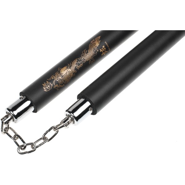 Nunchako do ćwiczeń sprawnościowych ze średnio twardej gąbki. Typowa treningowa wersja nunchako. Pałki - od wewnątrz plastikowa wkładka z wierzchu pokryta pianką. Połączone łańcuchami na łożyskach.