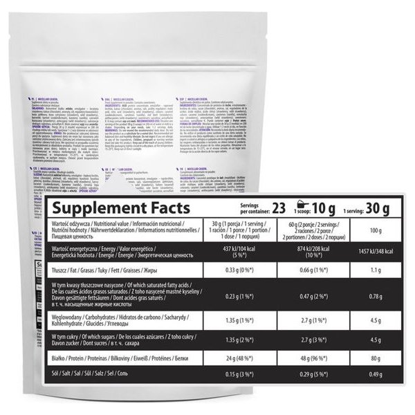 Bardzo długi czas wchłaniania kazeiny micelarnej zapewnia kilkugodzinny dopływ substancji budulcowych do tkanki mięśniowej. Kazeina ulega procesowi koagulacji w żołądku, co spowalnia jej trawienie i wydłuża czas wchłaniania. Micellar Casein to suplement dedykowany wszystkim sportowcom, bez względu na rodzaj uprawianej aktywności. Jest także odpowiedni dla osób, które posiadają zwiększone zapotrzebowanie na białko. Kazein micelarna stanowi skuteczny wspomagacz w okresie budowania masy mięśniowej oraz w trakcie stosowania diet odchudzających. Świetnie sprawdza się jako odżywka białkowa spożywana przed snem.