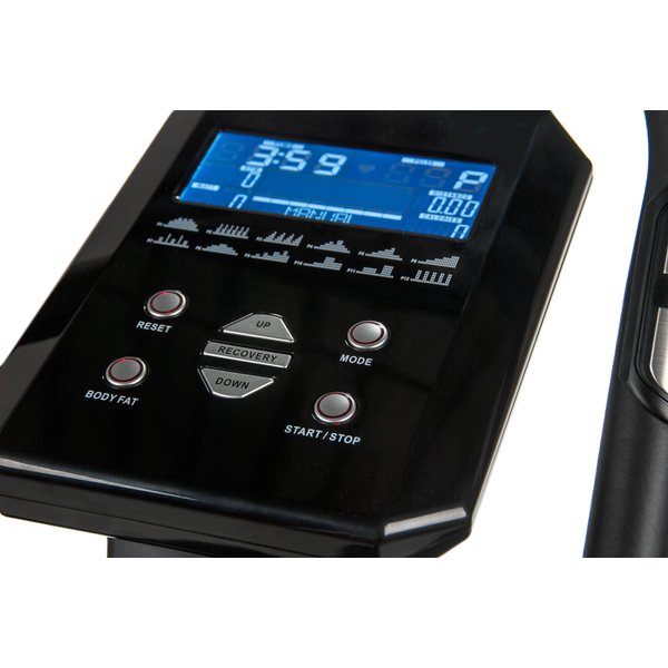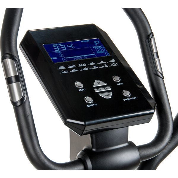 • czas, prędkość, kalorie, dystans, pomiar pulsu, Watt, RPM, pomiar tkanki tłuszczowej