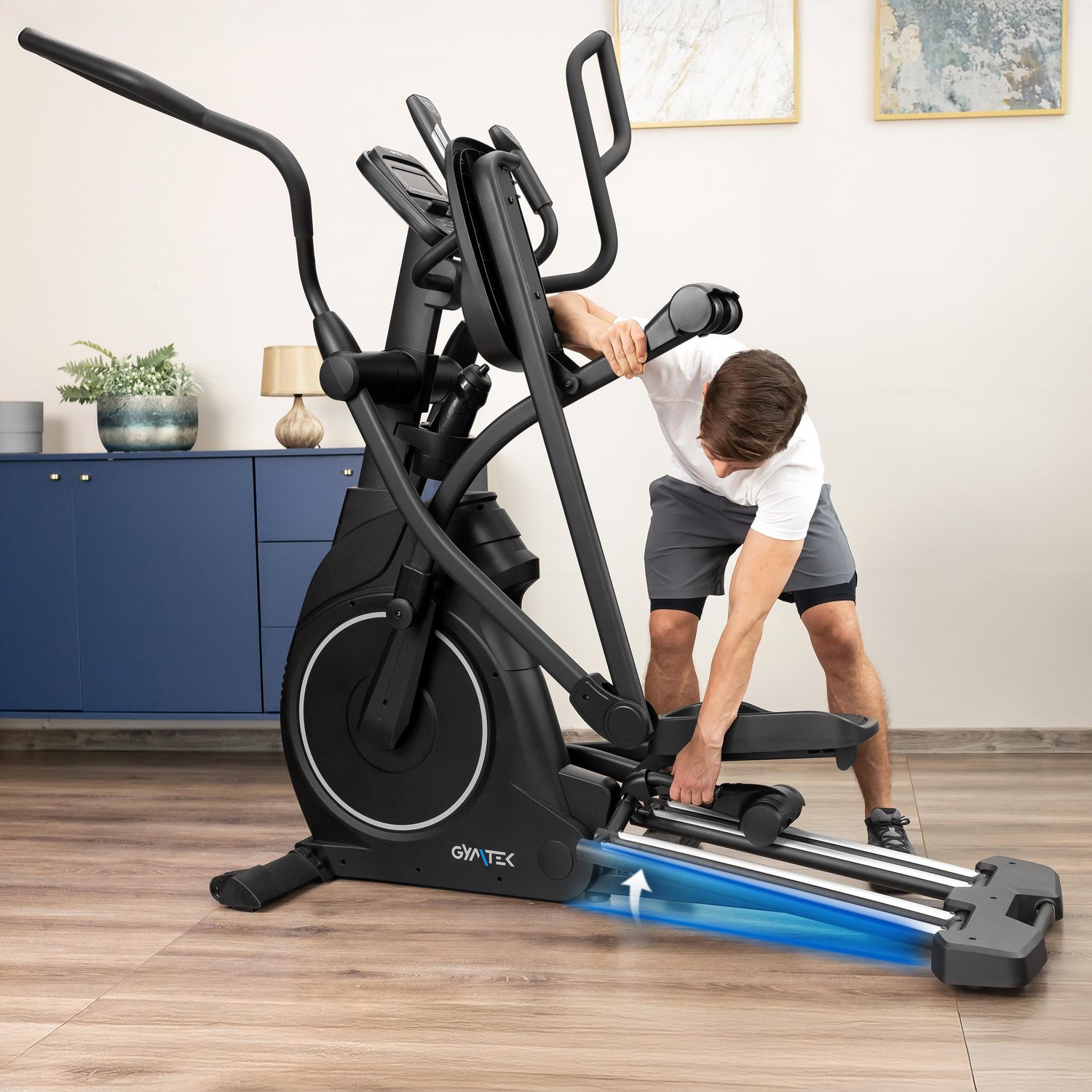 Możliwość regulacji nachylenia prowadnic umożliwia dostosowanie kąta toru ruchu pedałów do osobistych preferencji. Dzięki temu można zwiększyć intensywność, skuteczniej angażować dolne partie ciała oraz efektywniej spalać kalorie.