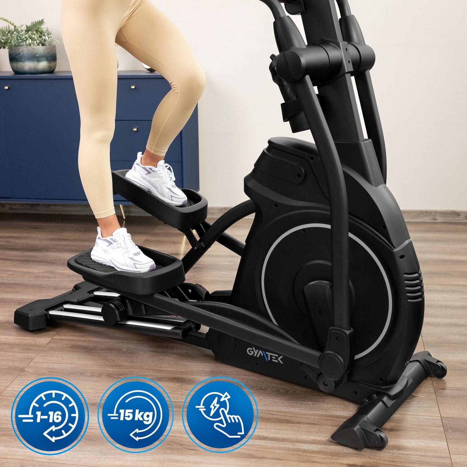 - Naturalny i ciągły ruch: System przedniego napędu zapewnia równomierne rozłożenie oporu, wspierając biomechanicznie poprawny przebieg ćwiczeń.