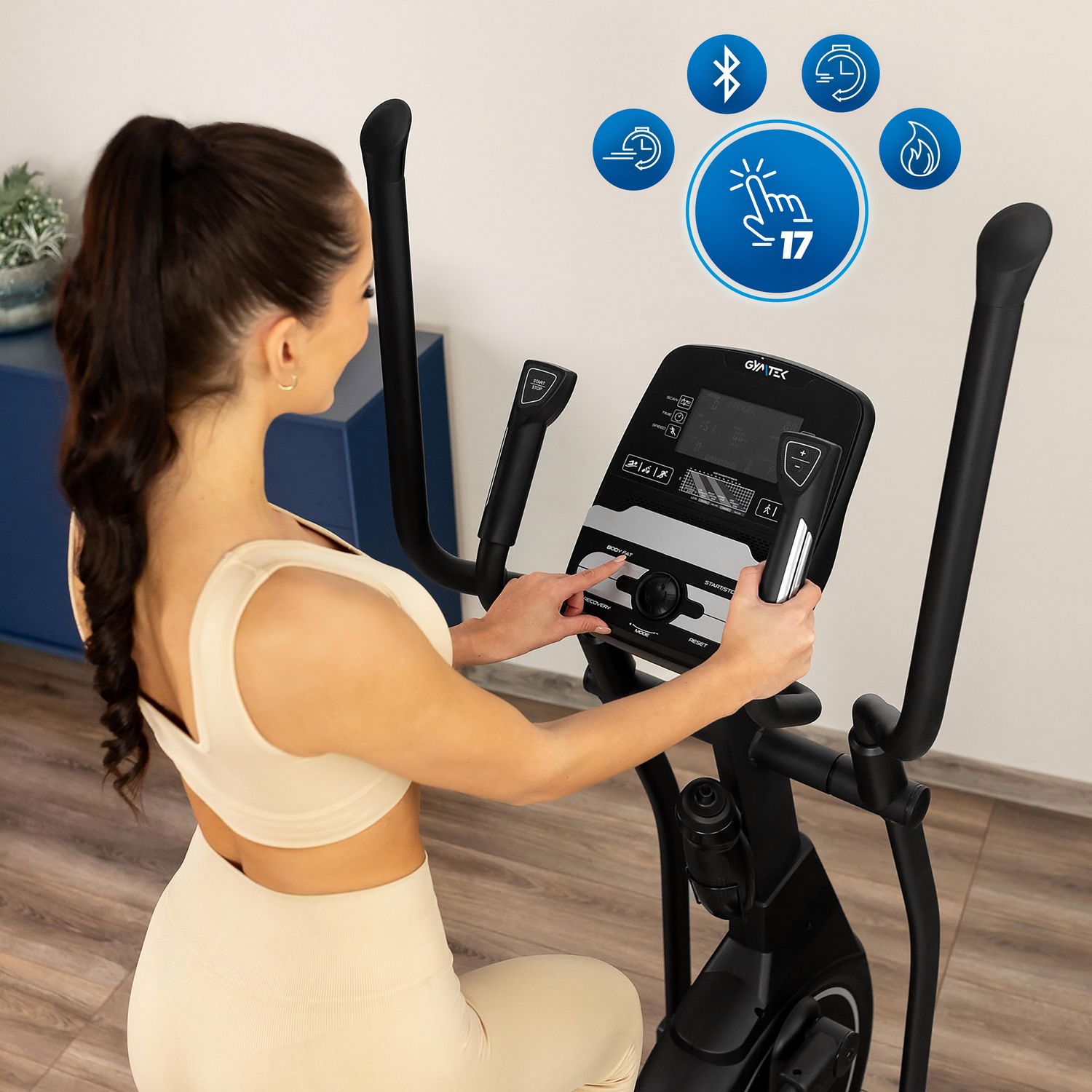 - Moduł Bluetooth: Dzięki łączności Bluetooth można połączyć orbitrek z aplikacjami FitShow i Kinomap, aby urozmaicić trening wirtualnymi trasami lub rywalizować z innymi użytkownikami. Taka interaktywna forma ćwiczeń zwiększa motywację i zapewnia jeszcze bardziej immersyjne doświadczenie.