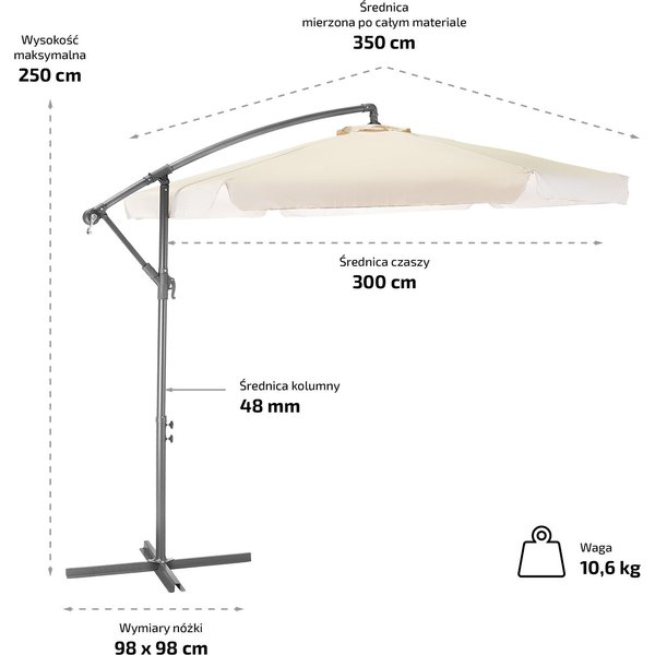 - Duża średnica czaszy parasola zapewnia komfort nie tylko podczas relaksu przy książce, ale także podczas dużych, rodzinnych imprez w ogrodzie.