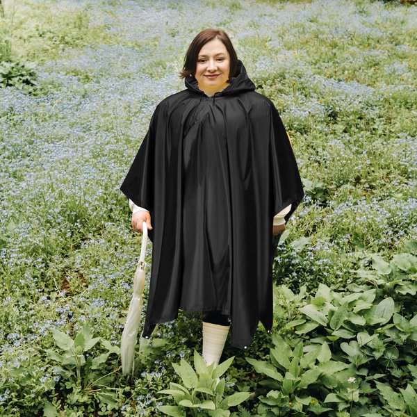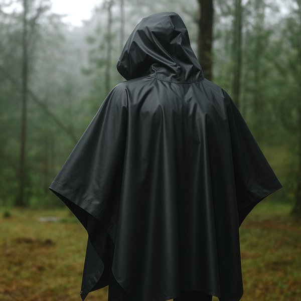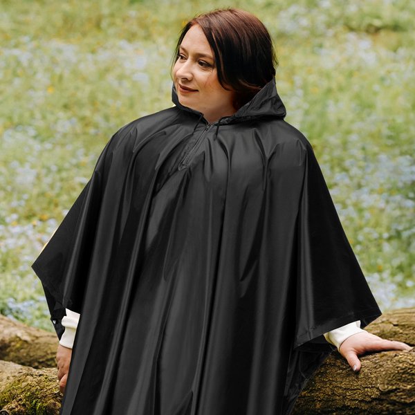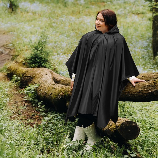 - Uniwersalny, obszerny krój: Szeroka konstrukcja sprawia, że peleryna pasuje na osoby o różnej budowie ciała i pozwala na założenie jej nawet na plecak czy grubszą odzież.