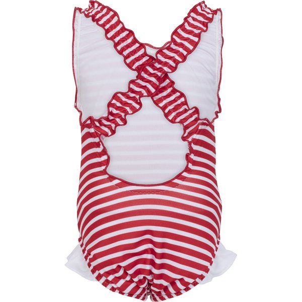 Juniorski strój kąpielowy Fashy Graphic Aquafeel to idealny wybór dla młodych miłośniczek wodnych przygód. Wykonany w 100% z poliestru, zapewnia doskonałą wytrzymałość i komfort podczas każdej zabawy w wodzie. Posiada certyfikat Oeko-Tex 100, co gwarantuje jego bezpieczeństwo dla skóry, dzięki testom na obecność szkodliwych substancji. Elastyczne wstawki oraz krzyżujące się ramiączka zapewniają swobodę ruchów, a ozdobne falbanki przy ramionach i nogawkach dodają uroku. Stylowy wzór w paski i dekoracyjna aplikacja z przodu sprawiają, że strój jest nie tylko funkcjonalny, ale również estetycznie atrakcyjny.