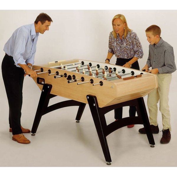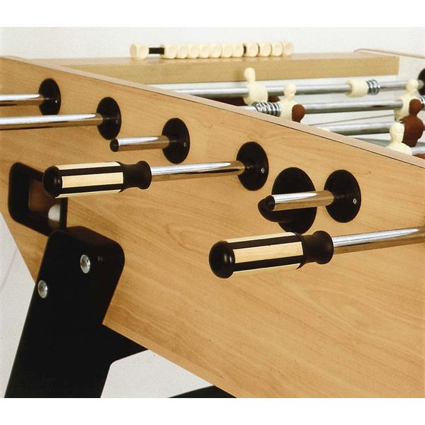 Obudowa wykonana z wysokiej jakości sklejki wielowarstwowej, która została pokryta plastikowym laminatem w kolorze naturalnego drewna. Plastikowe uchwyty posiadają ergonomiczny kształt, dzięki czemu dopasowują się do dłoni. Dodatkowo drewniane wstawki w uchwytach zapobiegają poceniu się dłoni. Ukośne nogi stołu, wykonane zostały bardzo starannie, z bukowego drewna o grubości 4cm. Można regulować ich wysokość, oraz wypoziomować pole stołu do gry. Boisko pokryte zostało piaskowaną szybą o grubości 5mm, z systemem anti-reflex, dzięki czemu nie odbija światła i umożliwia nam pełną kontrolę podczas gry. Drążki zostały wykonane ze stali szlachetnej, odporne na wyginanie. Do lekkiego i precyzyjnego prowadzenia drążków zostały użyte łożyska kulkowe, które pokryto chromowaną, antykorozyjną warstwą. Kieszeń na piłeczki znajduje się po obu stronach z tyłu stołu, z łatwością wyjmiesz z nich piłeczki po strzelonych bramkach. Figurki piłkarzyków są w kolorze jasnego i ciemnego drewna, wykonane starannie i precyzyjnie. Są zamocowane tak, aby stabilnie trzymały się drążka. Aby zredukować hałas, bramki pokryto filcem. W komplecie znajduje się również 10 piłeczek w kolorze białym.