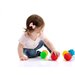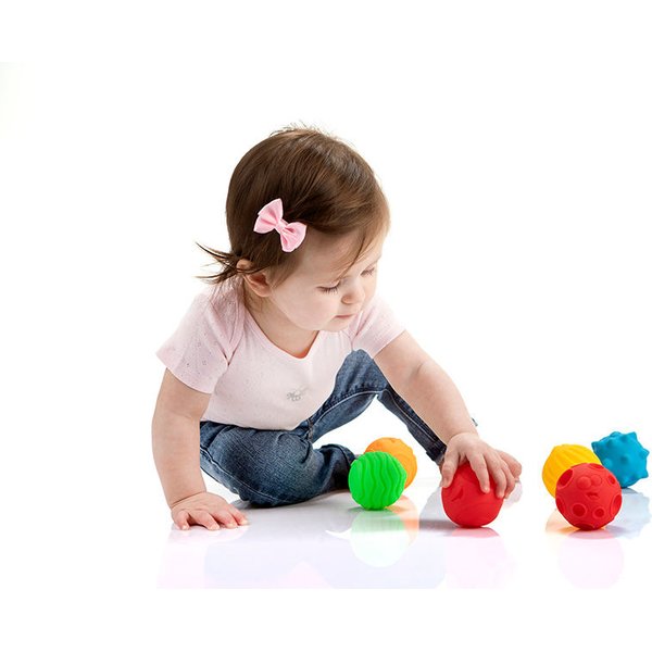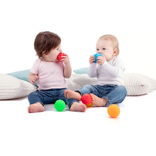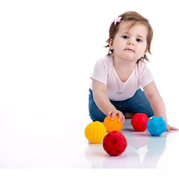 Kto by nie chciał takich roześmianych piłek? Posiadają piękne, żywe barwy, które z pewnością wpadną w oko. Każda z nich ma inną fakturę co pozwoli na stymulowanie zmysłu dotyku. Oprócz tego będą trenować chwyt i zdolności manualne. Przydać się mogą również podczas ząbkowania maluszka, ponieważ ich kształty pozwolą masować dziąsełka. Masaż nimi pozwala rozluźnić napięcie mięśniowe. Można nimi bawić się również podczas kąpieli.