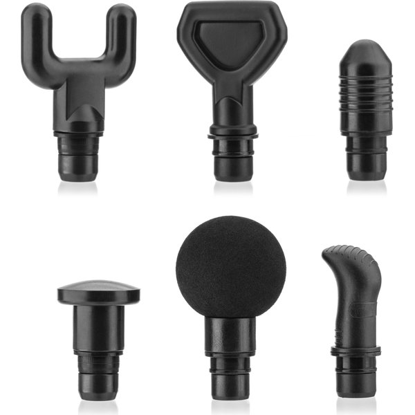 W zestawie otrzymasz aż 6 wymiennych końcówek, które pozwolą Ci skupić się na odmiennych partiach ciała. Głowica POCISK – najlepsza do rozbijania zgrubień w tkance mięśniowej. Pomaga dotrzeć do najgłębiej położonych mięśni. Głowica ŁOPATKA – rozluźnia spięte partie mięśniowe w dowolnym miejscu na ciele. Doskonale sprawdzi się po wyczerpującym treningu. Głowica w KSZTAŁCIE WIDEŁEK – służy do masażu długich oraz wąskich mięśni. Głowica SZPICZASTA – dociera do najgłębszych miejsc objętych bólem. Głowica OKRĄGŁA – używana do masażu każdej części ciała. Masaż przy jej pomocy należy do średnio intensywnych. Głowica ‘TŁUMIK dla mniej dostępnych miejsc, czułych obszarów lub obszarów w pobliżu kości.