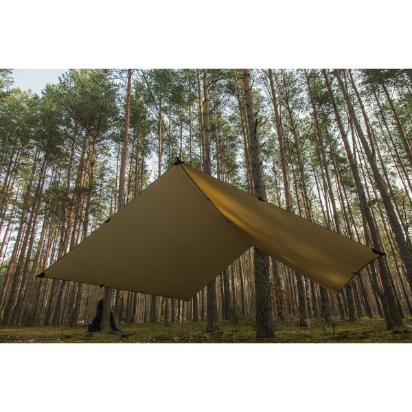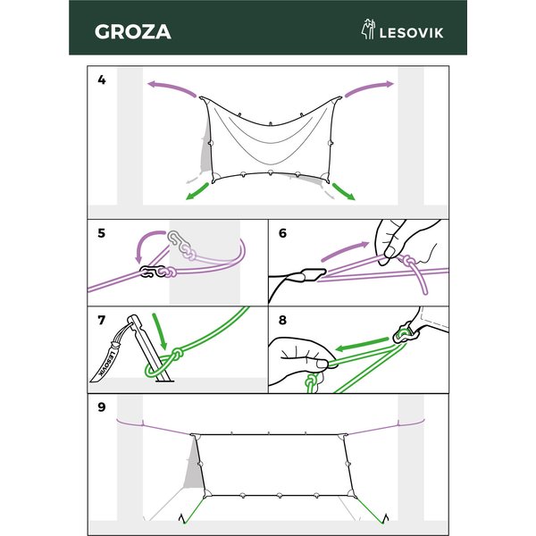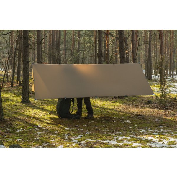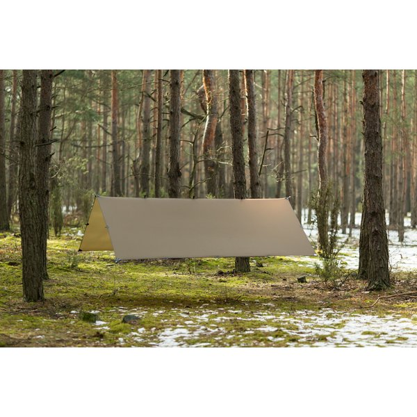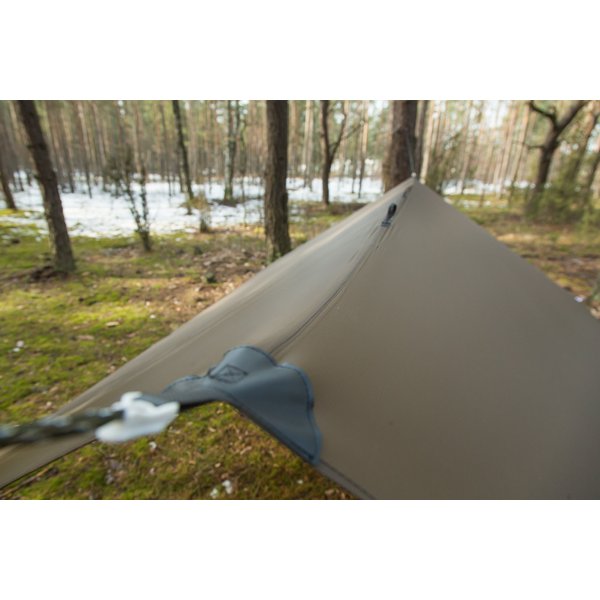 Dzięki dyskretnemu kolorowi, idealnie wtapia się w otoczenie leśnego biwaku, zapewniając nie tylko ochronę przed słońcem, ale także możliwość stworzenia ultralekkiego namiotu, parawanu czy tipi. Jego wymiary pozwalają na przestronne schronienie w przestrzeni obozowej, gdzie można spokojnie gotować, odpoczywać czy schronić się przed niepogodą. Płachta Groza jest wielokątnego kształtu, co umożliwia rozwieszenie jej na wiele sposobów, tworząc różne konfiguracje, takie jak daszek dwuspadowy, jednospadowy, "diament" czy schron.