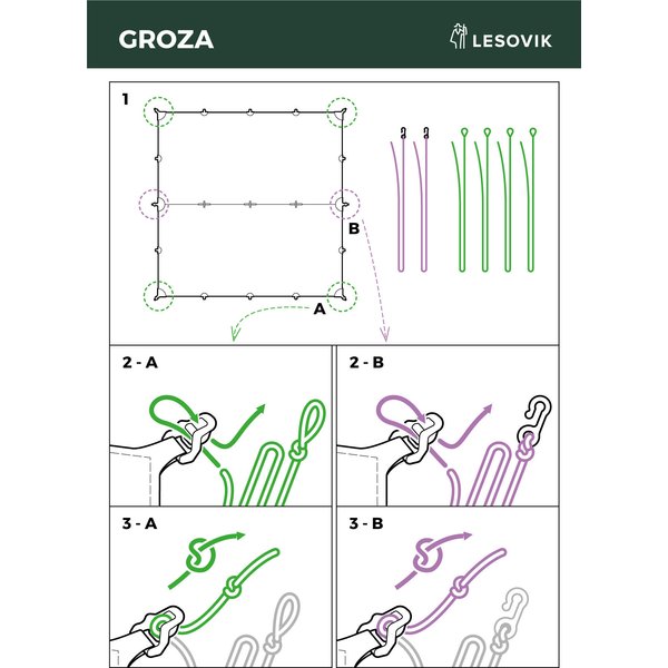 Dodatkowo, 19 punktów mocowania odciągów daje możliwość swobodnego wykorzystywania plandeki w różnych rolach, co sprawia, że Groza jest niezwykle wszechstronnym produktem. Aby jeszcze bardziej ułatwić obsługę tarpa, producent zastosował system wbudowanych napinaczy linek, który pozwala na łatwe i szybkie rozwieszenie płachty jedną ręką, bez konieczności znajomości węzłów.