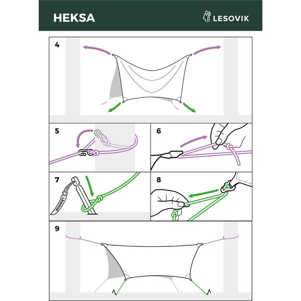 Dzięki swojemu sześciokątnemu kształtowi zapewnia nie tylko doskonałą ochronę przed deszczem i wiatrem, ale także mnóstwo możliwości wykorzystania. Punkty mocowania na rogach gwarantują szybkie i bezproblemowe rozwieszenie plandeki, a elastyczne linki ze specjalnymi napinaczami sprawiają, że obsługa tarpa staje się łatwa i przyjemna. Możliwość zastosowania jako zadaszenie nad hamakiem sprawia, że można cieszyć się komfortowym snem na świeżym powietrzu, bez obaw o zmienne warunki atmosferyczne. Dodatkowo, dzięki możliwości montażu między drzewami, płachta biwakowa Heksa Lesovik sprawdzi się jako samodzielny daszek, dający schronienie przed deszczem czy słońcem.