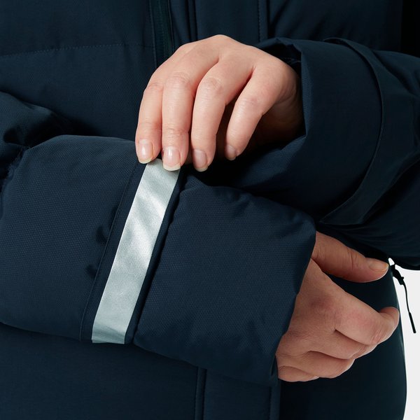 Wydłużony krój zapewnia lepsze krycie i pozytywnie wpływa na komfort noszenia. Możesz być pewna, że w tej kurtce zawsze będzie Ci ciepło. Dodatkowa ochrona nadgarstków zapobiega dostaniu się do środka mroźnego wiatru. Wysoki kołnierz z puszystym kapturem chronią kark oraz głowę. Kieszenie boczne umożliwiają przechowywanie drobiazgów. Dzięki zamknięciu na zamki YKK możesz mieć pewność, że rzeczy zostaną na swoim miejscu. Dodatkowa kieszeń na piersi pomieści dodatkowe drobiazgi. Kurtka posiada również elementy odblaskowe na rękawach, co zapewnia Ci bezpieczeństwo po zmroku.