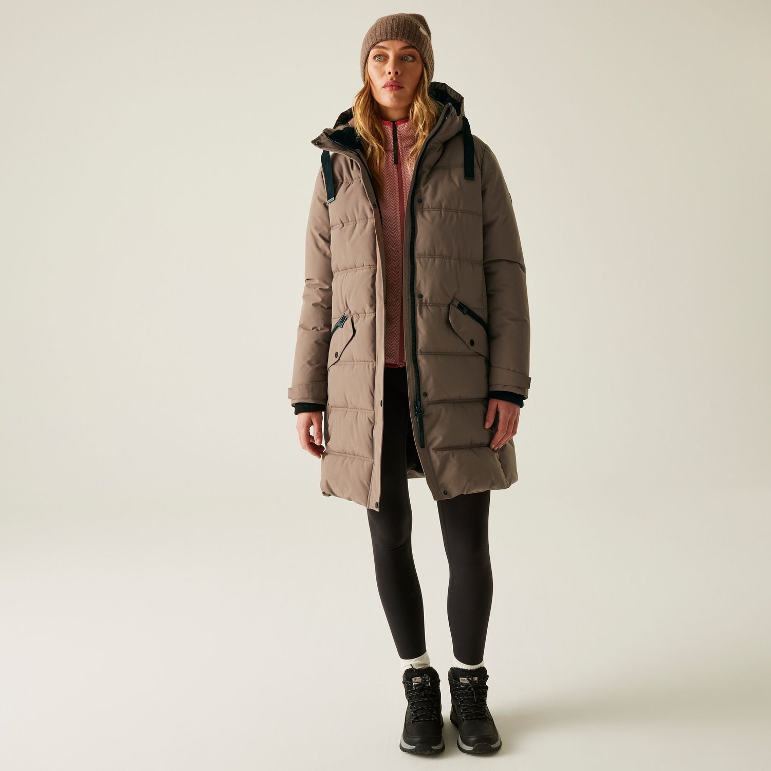 Praktyczność płaszcza Eryn podkreślają liczne kieszenie. Dwie dolne, naszywane kieszenie z ociepleniem oraz bocznymi otworami zapinanymi na zamki zapewniają wygodne miejsce do przechowywania drobiazgów oraz umożliwiają szybkie ogrzanie dłoni. Dodatkowe wewnętrzne kieszenie pozwalają na przechowywanie wartościowych przedmiotów, takich jak telefon czy dokumenty, z zapewnieniem pełnego bezpieczeństwa. Detale, takie jak kontrastowe podszewki rękawów i kaptura, a także subtelna naszywka na rękawie, nadają płaszczowi nowoczesnego charakteru, łącząc funkcjonalność z wyrafinowanym stylem. Pionowe przeszycia na kapturze oraz detale ze sznurkiem ściągającym dodają całości elegancji i wyjątkowego wyglądu.