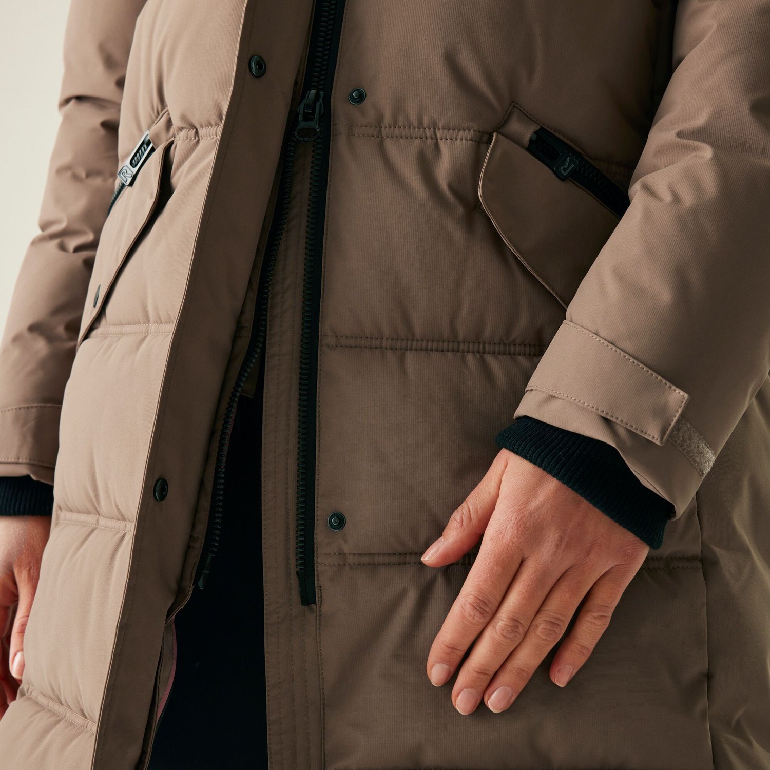 - 2 dolne naszywane kieszenie z ociepleniem i otworami bocznymi zapinanymi na zamek umożliwiającymi ogrzanie dłoni