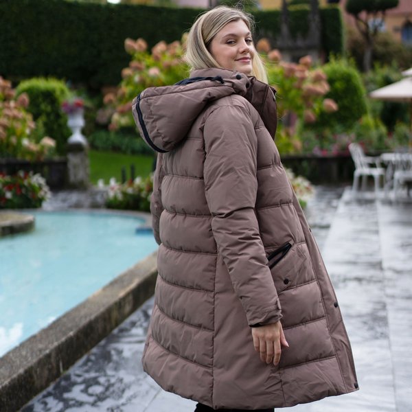 Dodatkowym atutem jest odpinany kaptur z miękką, polarową podszewką, który można dostosować do indywidualnych potrzeb, chroniąc głowę przed zimnem i wiatrem. Design płaszcza, z jego pikowaną strukturą i prostym krojem, pozwala na zachowanie elegancji nawet w najbardziej wymagających warunkach pogodowych. Długość do kolan zapewnia dodatkową ochronę ciepła, a elastyczne wykończenia mankietów gwarantują, że zimne powietrze nie dostanie się do środka. Dwukierunkowy zamek błyskawiczny oraz zapięcie na napy dodają komfortu użytkowania i umożliwiają szybkie dostosowanie płaszcza do zmieniającej się pogody.