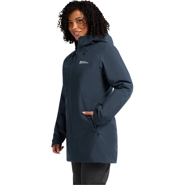 Płaszcz Heidelstein jest również wyposażony w praktyczne rozwiązania, które zwiększają jego funkcjonalność. Trzy kieszenie - dwie boczne oraz jedna wewnętrzna zapinana na zamek, pozwalają na bezpieczne przechowywanie niezbędnych drobiazgów, takich jak telefon, klucze czy portfel. Dwukierunkowy zamek błyskawiczny umożliwia wygodne zakładanie i zdejmowanie płaszcza, a także umożliwia regulację wentylacji, co jest szczególnie przydatne w trakcie intensywnego ruchu. Płaszcz Heidelstein cechuje się również dopracowanym krojem. Długość do połowy uda oraz profilowany obszar łokci zapewniają pełną swobodę ruchów, jednocześnie nadając sylwetce elegancki wygląd. Logo na piersi i rękawie podkreśla wysoką jakość wykonania oraz markę Jack Wolfskin, która od lat jest synonimem niezawodności i innowacyjności w odzieży outdoorowej.