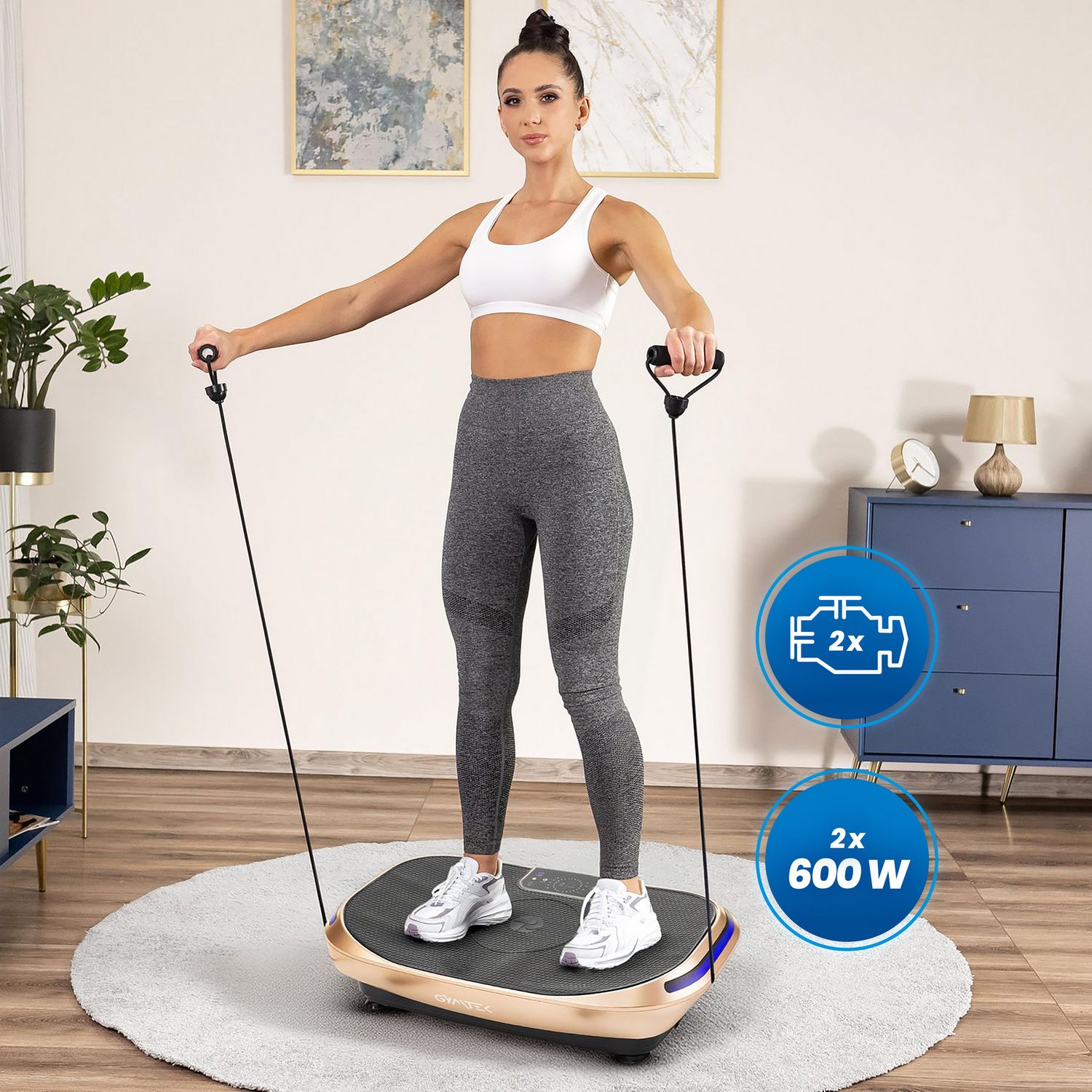 Podwójny system napędu zapewnia równomierne rozłożenie wibracji oraz stabilność podczas treningu. Dzięki zastosowaniu dwóch silników o łącznej mocy 600W platforma działa wydajnie i skutecznie, umożliwiając efektywną stymulację mięśni i komfortowe użytkowanie.