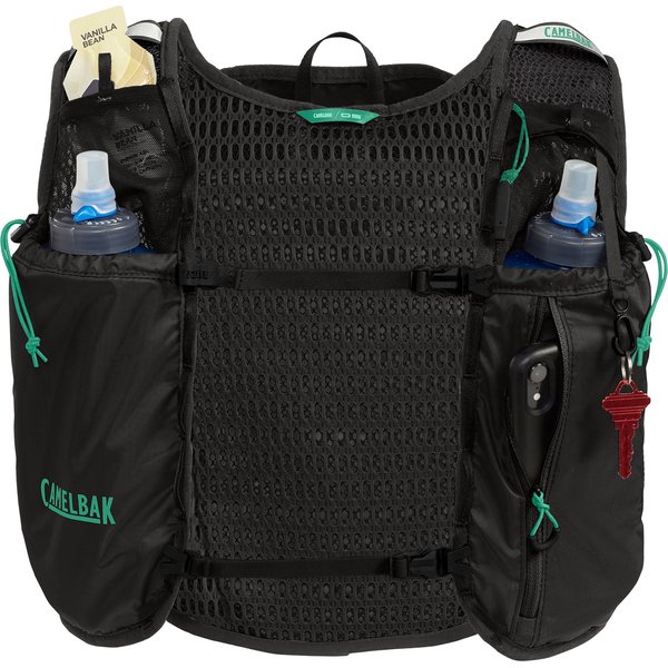Plecak CamelBak został zaprojektowany z myślą o praktyczności i wygodzie. Wyposażony jest w elastyczne kieszenie, które pozwalają na przechowywanie niezbędnych drobiazgów takich jak telefon czy klucze. Przestrzeń na drobne przedmioty jest nieoceniona podczas każdego treningu, a wytrzymałe zamki błyskawiczne zapewniają bezpieczeństwo przechowywanych rzeczy. Dodatkowo, kieszenie boczne z zamkiem i specjalne kieszenie na bidony to kolejne udogodnienia, które czynią ten plecak wyjątkowo funkcjonalnym. Dla biegaczy, którzy nie boją się wyzwań i często sięgają po kije trekkingowe, kamizelka oferuje specjalne uchwyty umożliwiające ich wygodne przenoszenie.