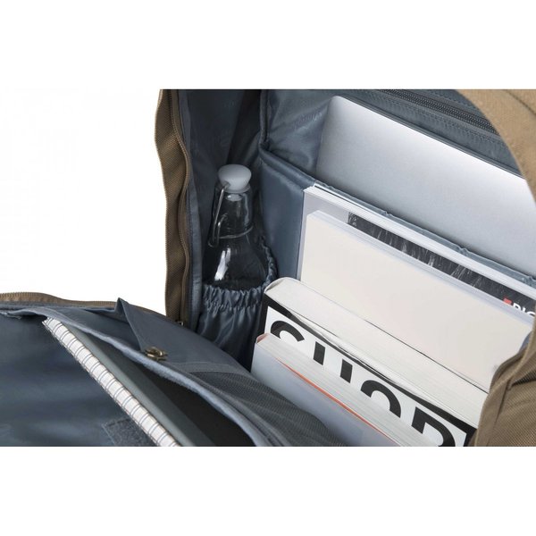 Podoba mi się, że plecak jest zrobiony z CORDURY. Zastanawiałem się nad mniejszą wersją, ale tamten jest z innego materiału i to mnie zniechęciło. W wersji large do bocznych kieszeni wchodzi składana parasolka z Rossmanna i butelka BEHALLARE z Ikei (te grubsze, np. STEKTID już nie). Przypuszczam, że w wersji standardowej pakowność bocznych kieszeni jest mniejsza.