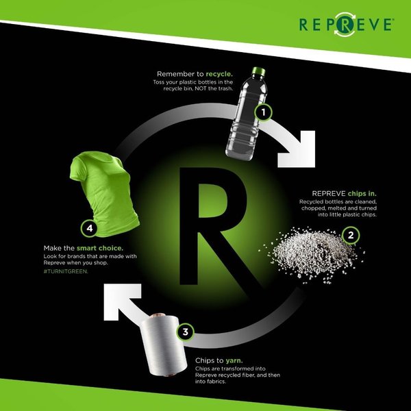 Zgodnie z badaniami UNIFI, wyprodukowanie włókna Repreve™ zużywa 45% mniej energii, emituje o ponad 30% mniej gazów cieplarnianych i zużywa o 20% mniej wody w porównaniu z produkcją zwykłego poliestru.