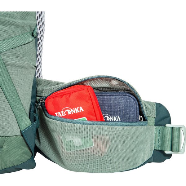 Plecak wyposażony jest w wiele przydatnych detali, takich jak pokrywa o regulowanej wysokości, pas piersiowy z regulacją, kompatybilność z systemem hydracyjnym czy kompresyjne paski boczne. Dodatkowym atutem jest pas biodrowy z kieszeniami zapinanymi na zamek, które pomieszczą drobiazgi. Warto także zwrócić uwagę na specjalną konstrukcję pasa biodrowego, który umożliwia regulację jedną ręką, co znacznie ułatwia korzystanie z plecaka podczas aktywności outdoorowych. Dodatkowo, osłona przeciwdeszczowa oraz osobna kieszeń na akcesoria pierwszej pomocy zwiększają funkcjonalność.