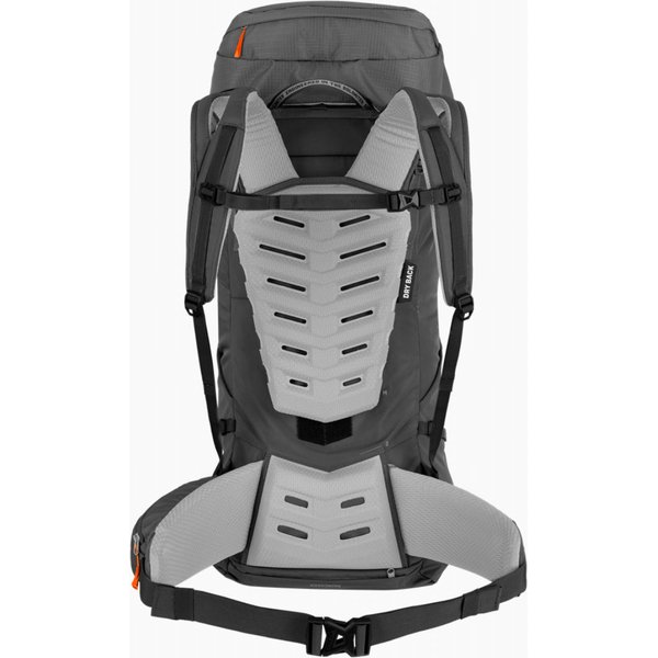 Łatwy w regulacji system nośny Dry Back Custom posiada regulowaną długość pleców oraz anatomicznie ukształtowane, wyściełane paski na ramiona, podparcie lędźwiowe i pas biodrowy, co umożliwia indywidualne dopasowanie. Ponadto, pasy nośne zapewniają optymalne dopasowanie do pleców na długich dystansach, a wstępnie ukształtowany pas biodrowy gwarantuje ścisłe dopasowanie i dobre przeniesienie obciążenia na biodra. Lekka konstrukcja plecaka pomaga utrzymać jego wagę na niskim poziomie.