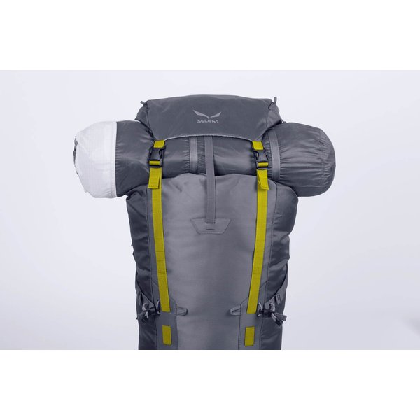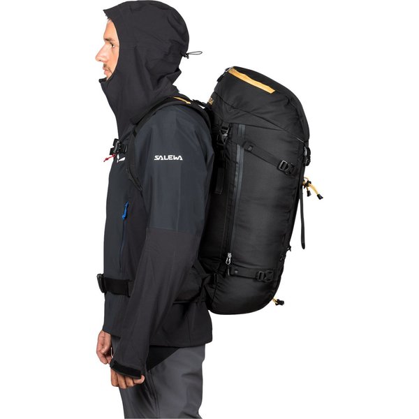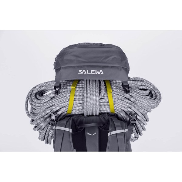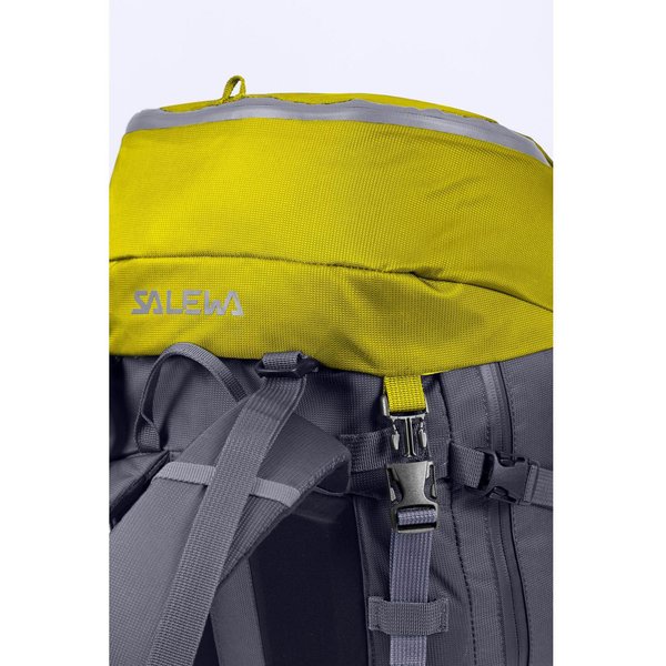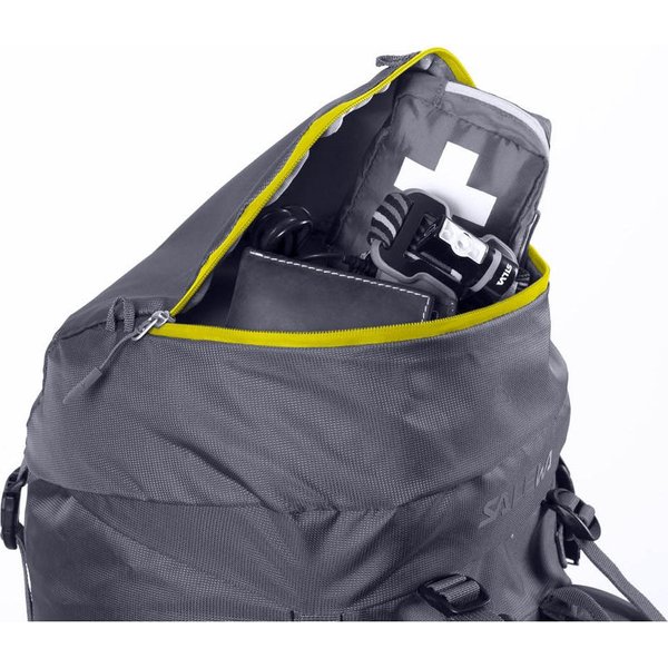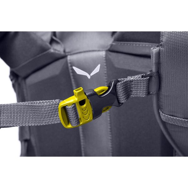 Guide posiada regulowaną klapę górną za pomocą czterech troków, dwóch z przodu i dwóch z tyłu. Dzięki temu klapa zawsze dokładnie przykrywa kamorę główną i jest tam gdzie powinna - niezależnie od tego, jak wiele ładunku jest w plecaku. Klapa jest również odpinana, co okaże się przydatne, gdy zechcesz użyć jej jako niezależnej torby do przeniesienia małych ładunków. Salewa wyposażyła plecak w gwizdek alarmowy, którego dźwięk niesie dalej niż najgłośniejszy krzyk, co czyni go niezbędnym podczas wyprawy w nieznane. Konstrukcja plecaka została przemyślana pod każdym aspektem. Gdy potrzebujesz czegoś z samego dna, szybko znajdziesz żądaną rzecz, korzystając z bocznego dostępu do zawartości. Główny zamek jest wodoodporny, co pozwoli zachować Twój ekwipunek suchym i wolnym od wilgoci.