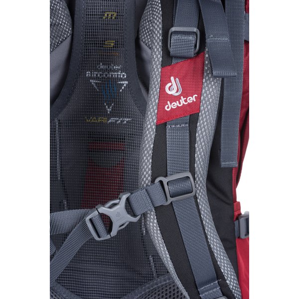 - Deuter Aircomfort FlexLite System - zaawansowana technologia pozwalająca obniżyć podczas wysiłku temperaturę ciała o około 3 stopnie Celsjusza. Renomowany Instytut w Hochenstein potwierdził, iż zastosowanie oryginalnego systemu z siatką firmy Deuter, redukuje potliwość o około 20 procent. Stelaż plecaka stanowią ultralekkie pręty oraz 2 szyny, pozwalające zachować właściwy kształt plecaka i zdystansować ładunek od pleców, nawet przy bardzo dużych obciążeniach plecaka. System nośny Aircomfort zapewnia sprawną cyrkulację powietrza zwiększając wentylację pleców i gwarantując wysoki komfort użytkowania.